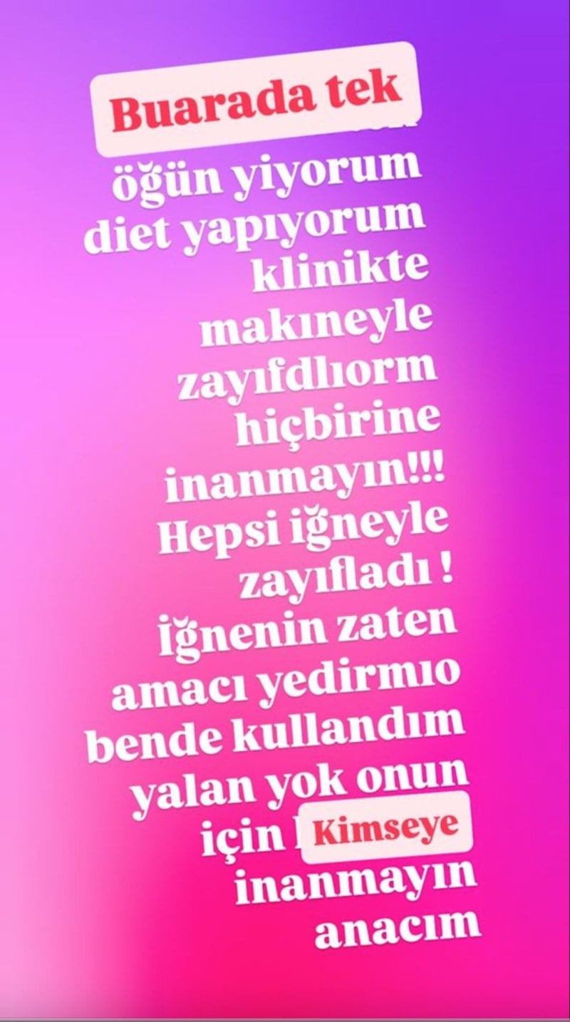 Akalın, paylaşımında şu ifadeleri kullandı: ‘Tek öğün yiyorum, diyet yapıyorum, klinikte makineyle zayıflıyorum’ diyenlere inanmayın. Hepsi iğneyle zayıfladı. İğnenin amacı zaten iştahı kesmek. Ben de kullandım, yalan yok. Onun için kimseye inanmayın anacığım.