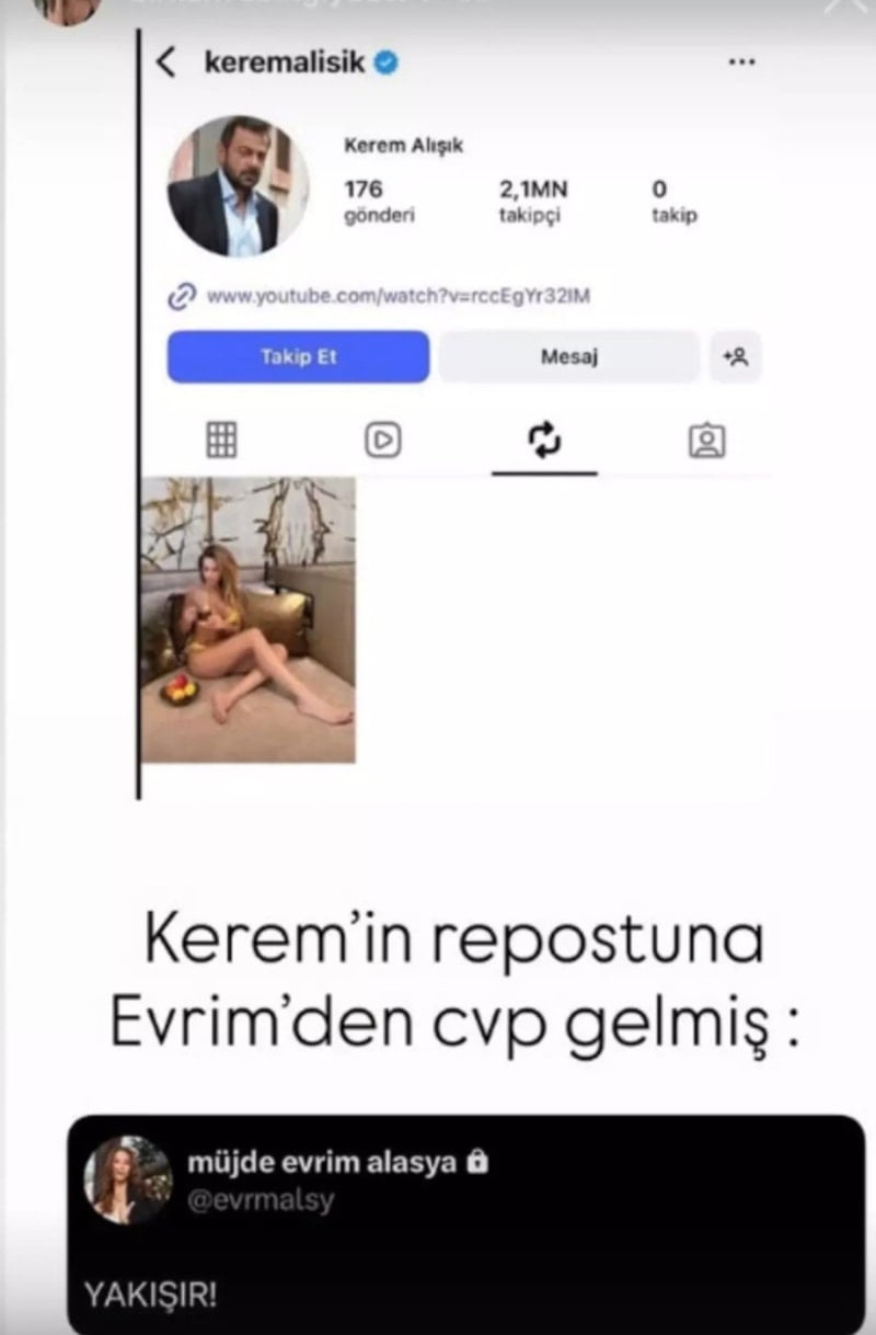 Öte yandan ayrılık haberleri duyulmadan hemen önce Kerem Alışık’ın, seksi bir kadını Instagram hesabında RT ettiği dikkat çekti. Evrim Alasya ise bunun üzerine “Yakışır” yazdı.