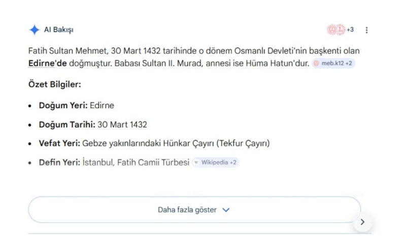 Zamanı kısıtlı olan kullanıcılar için geliştirilen AI Bakışı özelliği, sorgularla ilgili temel bilgileri ve kaynak bağlantılarını doğrudan sonuç sayfasının en üstünde sunuyor.