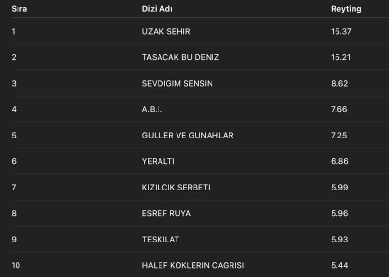 Açıklanan verilere göre “Uzak Şehir” aldığı 15.37 reytingle listenin zirvesinde yer aldı.