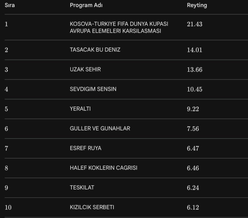 Milli maçı, TRT1’in sevilen dizisi Taşacak Bu Deniz takip etti. Üçüncü sırada ise Kanal D ekranlarında yayınlanan Uzak Şehir yer aldı.