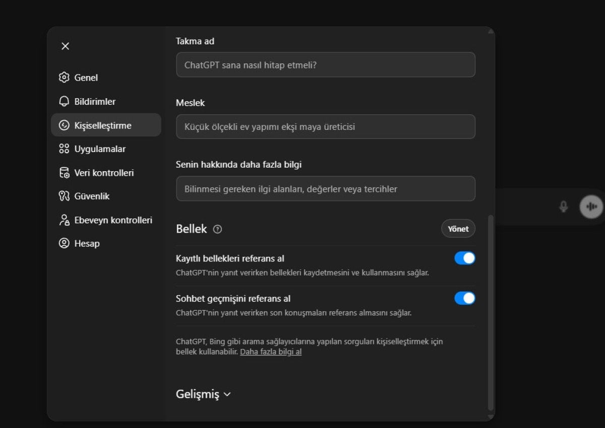 Kişiselleştirme menüsü altındaki bellek ayarlarını düzenleyerek yapay zekanın sizin hakkınızda hatırladığı eski veya gereksiz bilgileri silebilirsiniz.