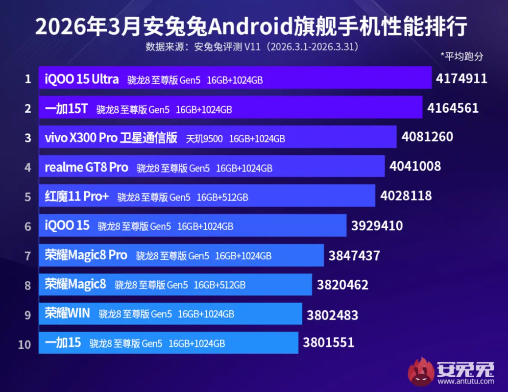 AnTuTu’nun Mart 2026 sıralamasında zirveye çıkan model, ortalama 4.174.911 puanla iQOO 15 Ultra oldu. Listenin ikinci sırasında ise 4.164.561 puanla OnePlus 15T yer aldı. En ilginç detay ise aynı Snapdragon 8 Elite Gen 5 işlemcisini kullanan OnePlus 15’in ancak onuncu sırada kalabilmesi. OnePlus 15T’nin daha etkili soğutma sistemi ve agresif performans ayarı sayesinde bu belirgin farkı yarattığı belirtiliyor.