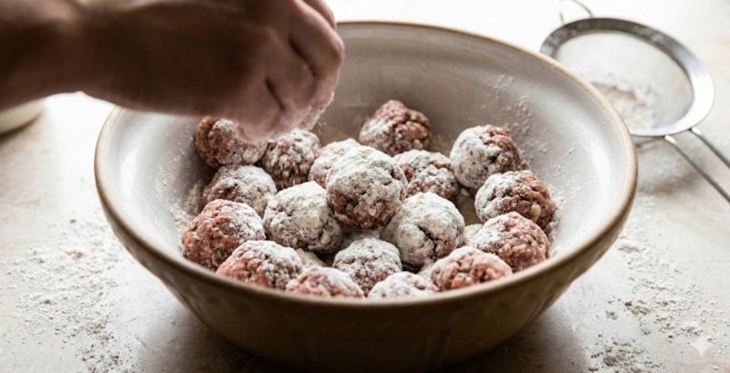 Ardından bu topları bol un bulunan bir kaba alıp kabı hafifçe sallayarak her bir parçanın unla tamamen kaplanmasını sağlıyorsunuz. Bu işlem sırasında kıymanın dışı adeta ince bir hamur tabakasıyla sarılıyor.