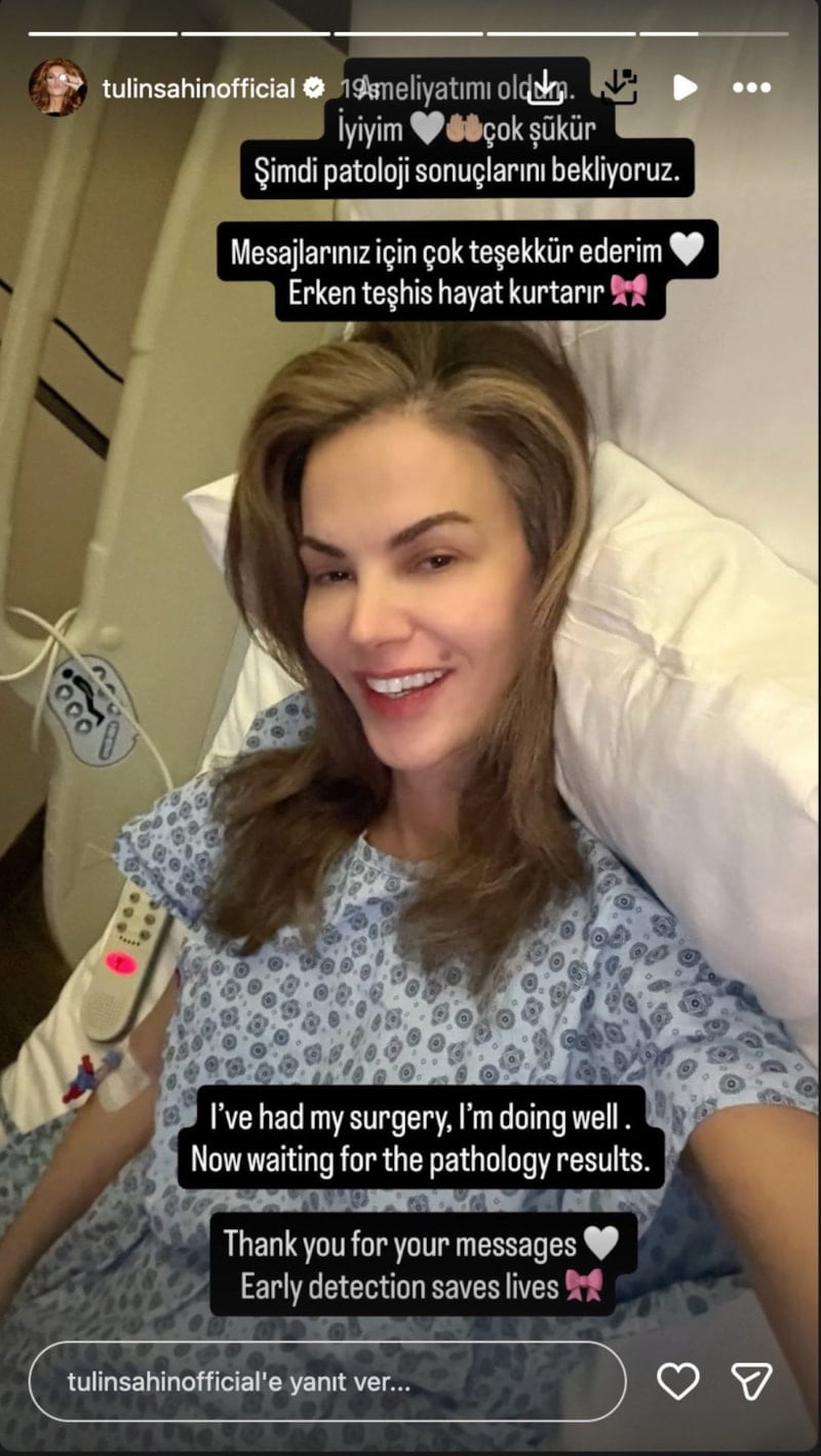 Hasta yatağından bir fotoğraf paylaşan Şahin “Ameliyat oldum. İyiyim, çok şükür. Şimdi patoloji sonuçlarını bekliyoruz. Erken teşhis hayat kurtarır” dedi.
